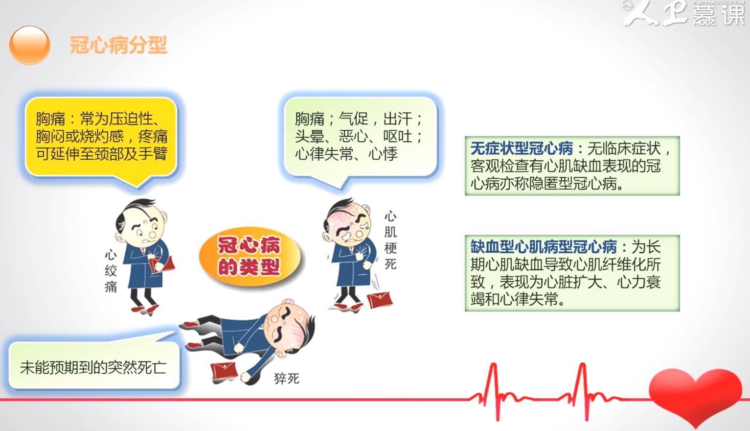 4. 無癥狀型冠心。 病人無臨床癥狀,客觀檢查有心肌缺血表現(xiàn)的冠心病亦稱隱匿型冠心病。病人多屬中年以上,無心肌缺血的癥狀,在體格檢查時發(fā)現(xiàn)心電圖有ST段壓低、T波倒置等,或放射性核素心肌顯像顯示心肌缺血表現(xiàn)。